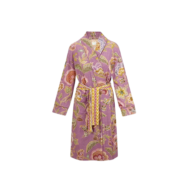 El kimono Nisha es una opción elegante y cómoda para todos los días. Tiene mangas largas al tono y está confeccionado en una viscosa elástica súper suave, lo que lo hace muy confortable. Incluye un cinturón a juego que permite ajustarlo para un calce perfecto. El diseño Matata presenta grandes flores y hojas inspiradas en los estampados africanos tipo wax. Las flores están decoradas con bordes punteados, rayas y otros detalles lúdicos. El fondo tiene un sutil patrón de puntos que completa el look con delicadeza. Combiná este kimono con otras prendas de la colección Matata para un look completo y con mucha onda.