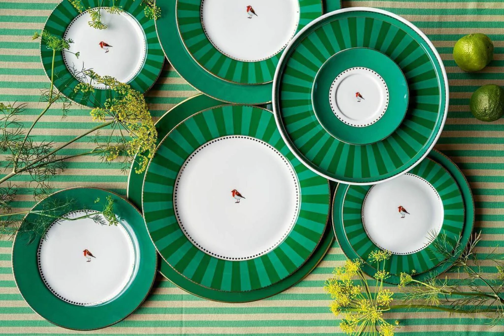 Este pequeño plato para pasteles o té es parte de la colección favorita de Pip, "Love Birds". Decorado con un borde a rayas verdes con detalles dorados. La pieza central que atrae todas las miradas es un petirrojo de colores brillantes. Combina de manera hermosa con los demás artículos de porcelana de esta colección.