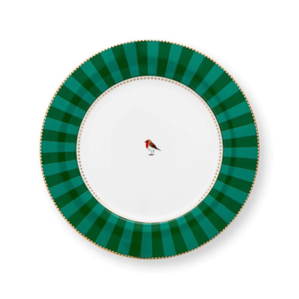 Este plato de cena es parte de la colección favorita de Pip, "Love Birds". Decorado con un borde a rayas verdes con detalles dorados. La pieza central que atrae todas las miradas es un petirrojo de colores brillantes. Combina de manera hermosa con los demás artículos de porcelana de esta colección.