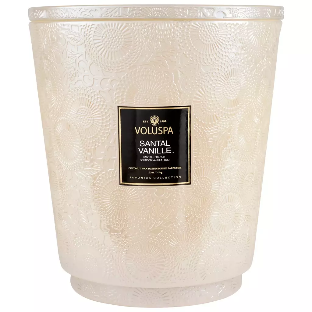La mezcla única de cera de coco de Voluspa se vierte a mano en un recipiente de 123 oz. Recipiente de vidrio repujado y rematado con una tapa a juego que mantiene la vela libre de polvo cuando no está en uso. Nuestras cinco mechas te permiten disfrutar de la fragancia durante 250 horas. Nuestras velas se vierten a mano en los Estados Unidos y cuentan con nuestra mezcla patentada de cera de coco de combustión limpia y mechas 100 % naturales. Nuestros productos están libres de ftalatos, pesticidas, parabenos y sulfatos y nunca se prueban en animales. Convierta este best seller en un recuerdo después de la última quema.