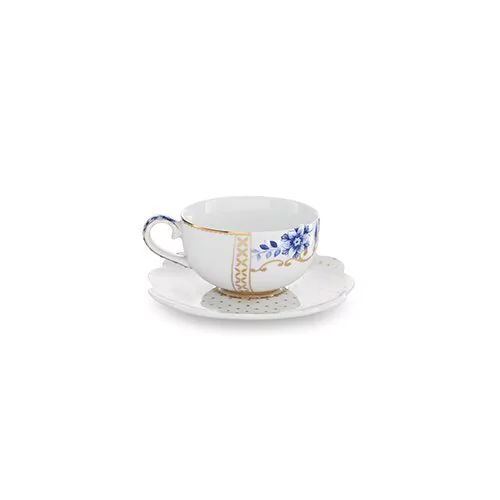 Taza de cafe con plato de porcelana, con estampado azul y dorado.