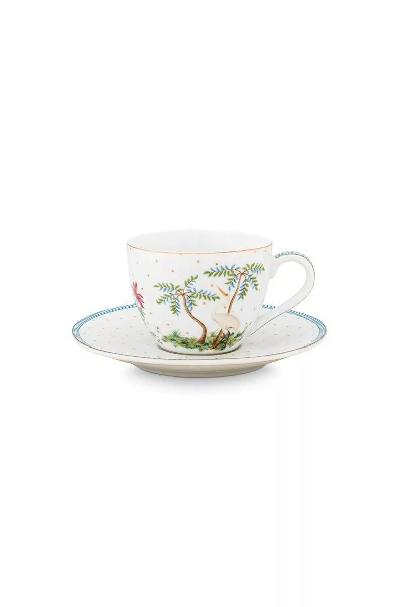 Te presentamos: nuestra taza de café Jolie y su plato. Este set se define por sus puntos dorados y hermosos detalles azules. Encontrarás estos detalles azules en el borde y el asa de la taza. El plato de este set tiene un hermoso diseño con flores tropicales y coloridas. Además, el plato está decorado con puntos dorados al igual que la taza.