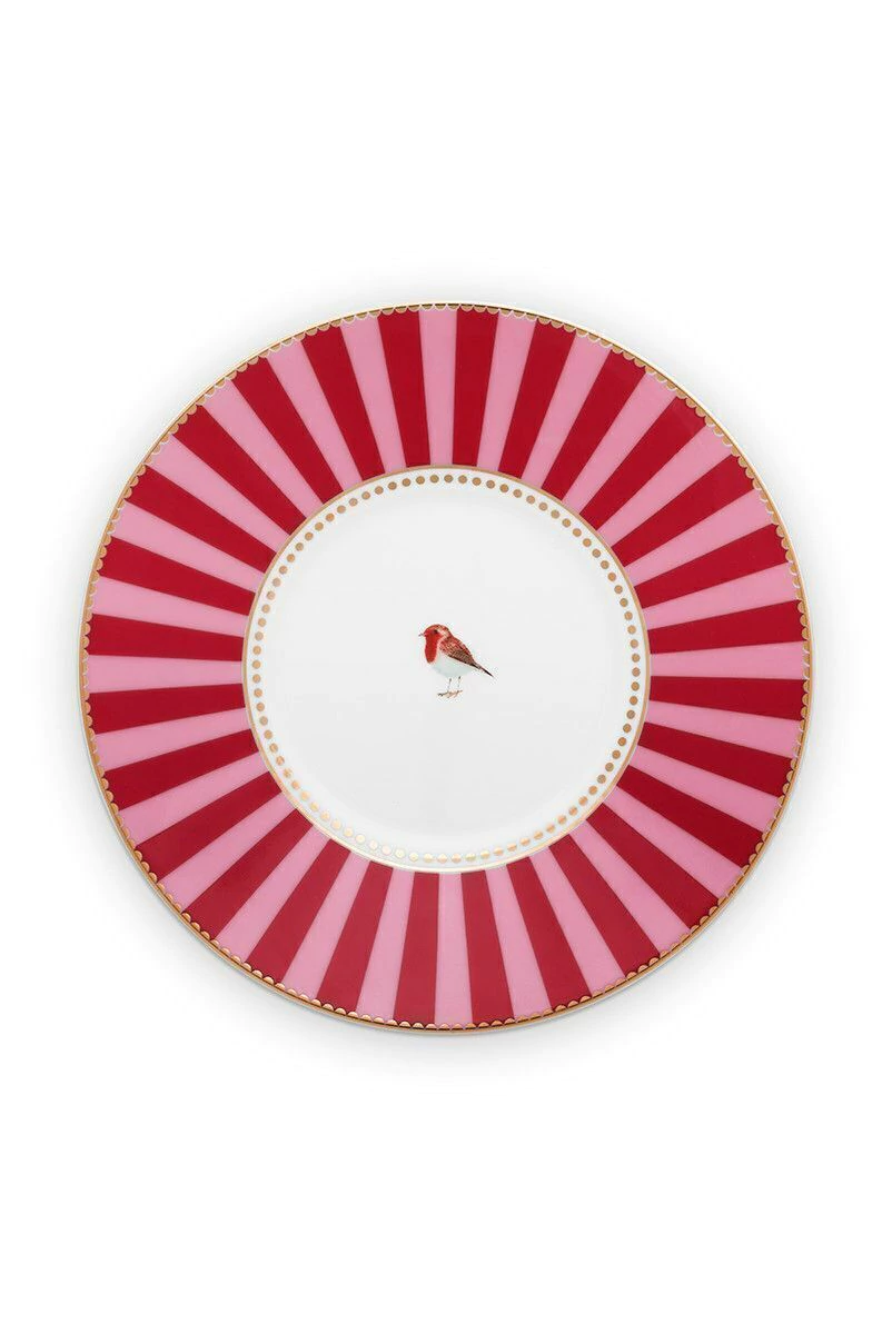 Una taza y platillo de porcelana en tonos rojos y rosados de la colección favorita de Pip Love Birds. El medallón decorativo con un petirrojo en el centro es el detalle principal. Decorado con elementos decorativos dorados curvados y un diseño elegante de formas y rayas, este set tiene el tamaño perfecto para todas tus bebidas calientes. Cada taza está adornada con lujosos detalles, como el acabado dorado en el asa.