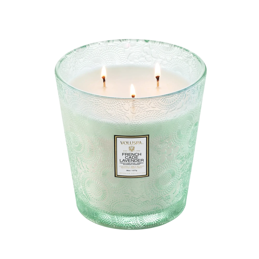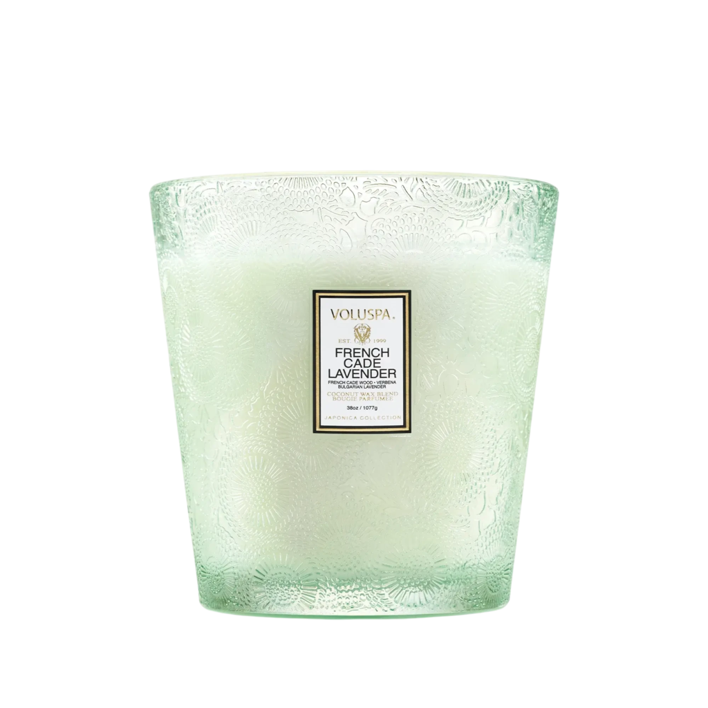 La exclusiva mezcla de cera de coco de Voluspa se presenta en un frasco de vidrio grabado de 38 oz con caja decorativa para regalo.